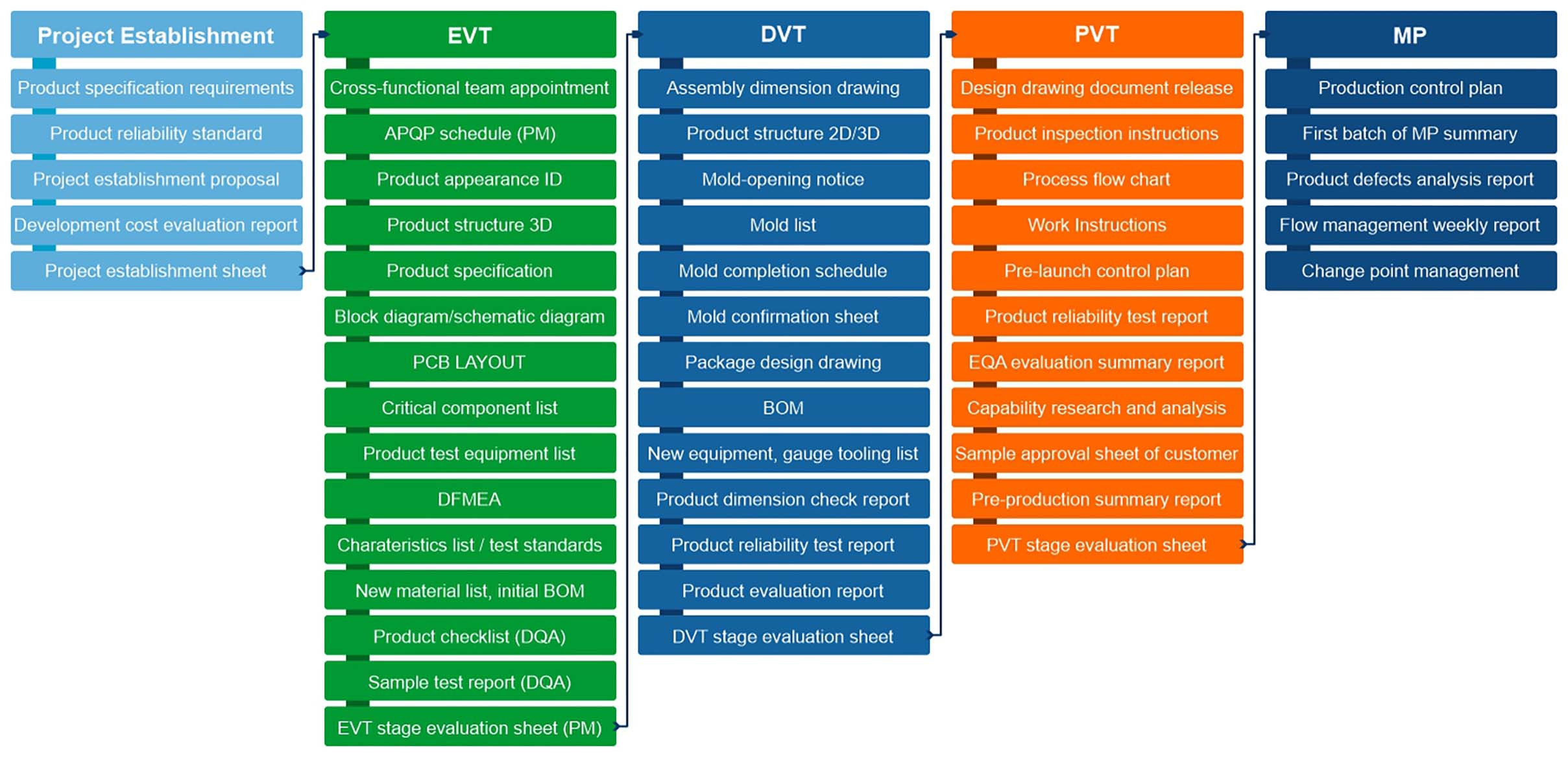 SUMER has years of experience in the OEM parts supply field and provides its services to customers in line with a comprehensive project classification. For OEM projects, SUMER starts with regular meetings with car factory engineering and design sector people to finalize the requirements and design of the product, mutually agree on them, document them, and freeze them. When the project is well-defined and all parties involved have a perfect understanding of it, SUMER issues a Product Design Specification (PDS) that covers all aspects of the project to document its understanding of the project. SUMER then proposes the price, contract terms, and timetable for R&D and production stages to the customer. Once the contract is signed, the team categorizes the project timetable based on its nature. SUMER follows the steps illustrated in the chart below as a sample for developing electronic parts.
